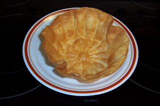 Deep fried taco shell, using A 12 inch flour tortilla shell, I used A taco salad shell form to dip the shell into the hot oil.